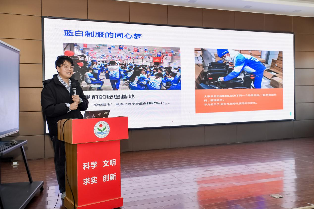 在交流环节中,来自快手的10位员工志愿者依次向同学们展示作品,并分享创作背后的故事,带领大家感受生活中的那些“哇塞”瞬间。《我的冬奥志愿者故事》作者吴潇轩讲述了自己作为冬奥会志愿者的经历,从选拔、培训到全程保障赛事工作,在寒冷冬日里与伙伴们并肩奋战,成为他最难忘的时光,他勉励同学们:“愿你们的每一份热爱,都能抵达想要去的远方。”